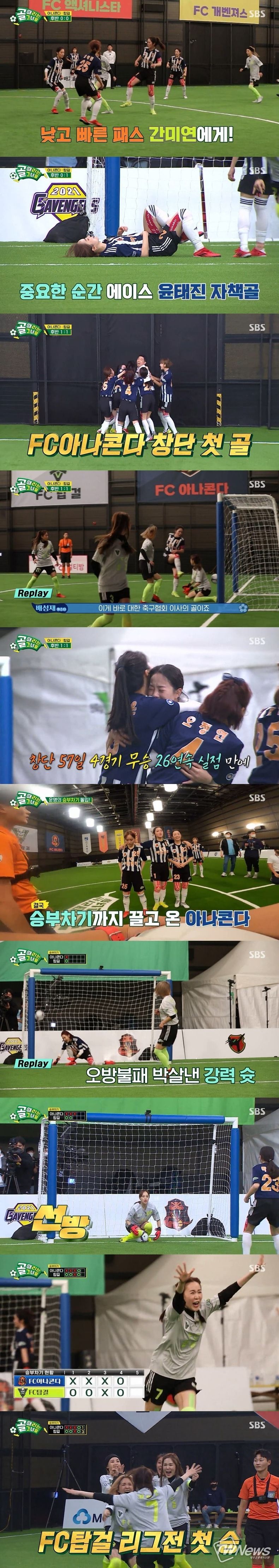 배성재는 "이게 바로 대한축구협회 이사의 골"이라며 기쁨을 감추지 못했고, 윤태진은 "오늘을 위해서 매일매일 축구 연습하면서 준비를 했다"며 그간의 연습량을 가늠케 했다. FC 아나콘다는 4경기 26실점만에 소중한 창단 첫 골을 터뜨리며 1:1 동점으로 경기를 승부차기로 끌고 갔다.