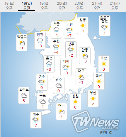 (19일) 아침최저기온은 서울 -5도, 인천 -3도, 수원 -4도 등 -9~-3도, 낮최고기온은 서울 3도, 인천 4도, 수원 4도 등 2~5도가 되겠다.