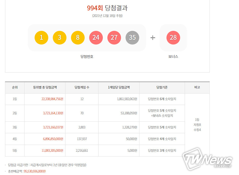 [제주교통복지신문 최효열 기자] 994회 로또 1등당첨번호조회는 " 24, 27, 1, 35, 3, 8 "이다. 2등 보너스번호는 " 28 "이다.