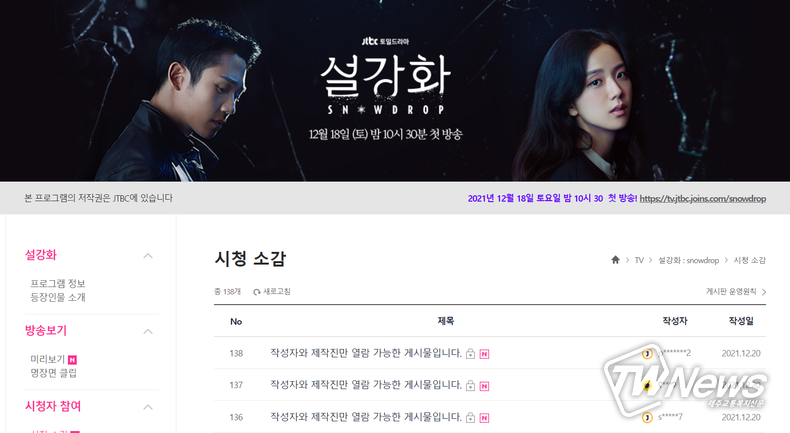20일 현재 JTBC ‘설강화’ 시청 소감 게시판의 글에는 모두 자물쇠가 달려있다. 제목도 ‘작성자와 제작진만 열람 가능한 게시물입니다’라는 제목으로 통일됐다. 일반인은 글의 내용 확인이 불가능한 것.