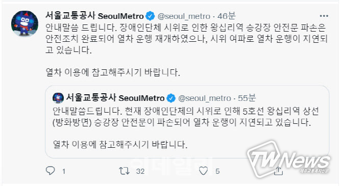 서울교통공사에 따르면 전국장애인차별철폐연대(전장연) 등은 이날 오전 7시 12분께부터 서울 지하철 5호선 왕십리역에서 장애인 이동권 보장 시위를 벌였다.