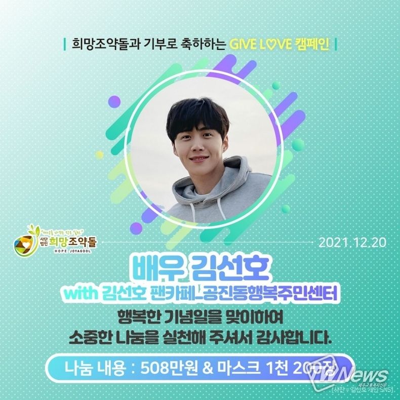 김선호의 팬클럽 ‘공진동행복주민센터_선호의 뽀시래기들’은 영화 ‘슬픈열대’ 촬영을 기념하며 빈곤 어르신들을 위해 NGO단체 희망조약돌에 기부금 및 기부물품을 후원했다. 이들이 전달한 기부금 508만 원과 마스크 1,200장은 겨울철 독거노인들의 생계유지 및 정서 지원을 위해 사용된다.