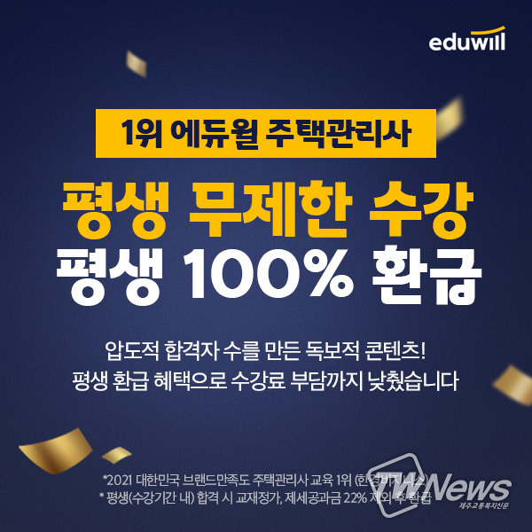 [제주교통복지신문 이주원 기자] 종합교육기업 에듀윌(대표 이중현)은 주택관리사 시험을 대비하여 수험생의 실력 향상을 돕는 ‘평생환급 평생패스’ 과정의 수강생을 모집한다고 21일 밝혔다.