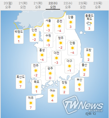 (22일) 아침최저기온은 서울 -3도, 인천 -3도, 수원 -4도 등 -9~-2도, 낮최고기온은 서울 7도, 인천 5도, 수원 7도 등 5~8도가 되겠다.