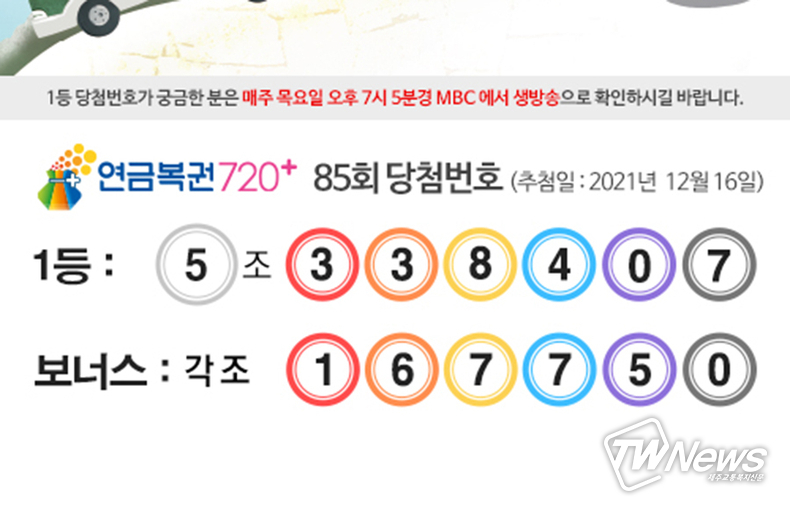[제주교통복지신문 최효열 기자] 지난주 연금복권720+당첨확인 85회차 1등 당첨번호는 " 5조 338407 "이다. 보너스번호는 " 각조 167750 "이다.