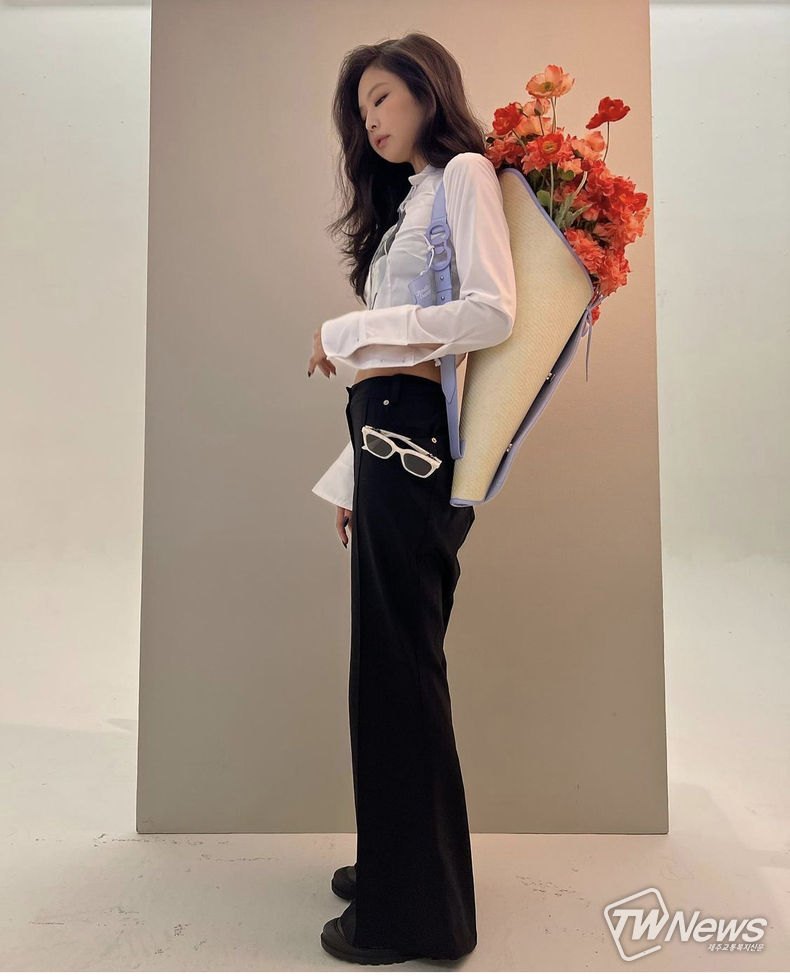 사진 속 제니는 젠틀몬스터(GENTLE MONSTER)와의 협업 제품으로 보이는 화이트 컬러의 선글라스와 거대한 꽃 가방을 멘 과감한 포즈로 완벽한 스타일링을 선보이며 독보적인 매력을 발산했다.