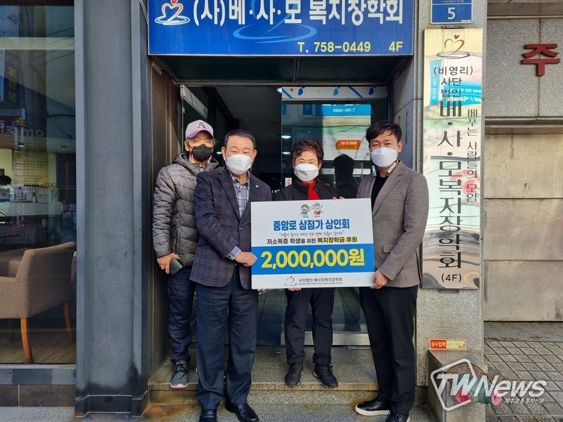 [제주교통복지신문 김현석 기자] 제주 중앙로 상점가 상인회(회장 양창영)는 22일 저소득층 가정과 학업에 전념하는 학생들을 돕고자 (사)베사모 복지장학회(이사장 양종현)에 200만원의 복지장학금을 기탁했다고 밝혔다.