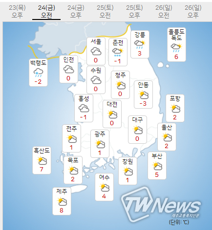 (24일) 아침최저기온은 서울 0도, 인천 0도, 수원 0도 등 -3~2도, 낮최고기온은 서울 2도, 인천 1도, 수원 3도 등 1~4도가 되겠다.