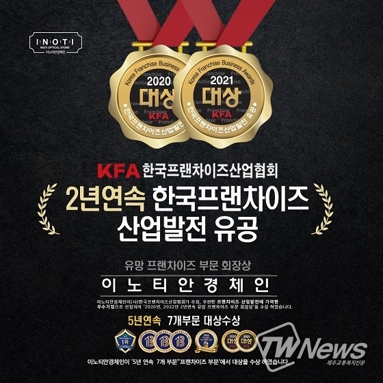[제주교통복지신문 신혜정 기자] 이노티안경체인이 2년연속 '2021 제21회 한국프랜차이즈 산업발전 유공(한국프랜차이즈 대상)'에서 유망 프랜차이즈 부문에서 프랜차이즈협회 회장상을 지난 16일 수상했다고 밝혔다.