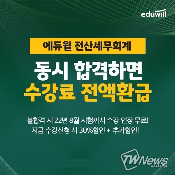 [제주교통복지신문 김대훈 기자] 종합교육기업 에듀윌(대표 이중현)은 전산세무회계 자격증을 동시에 2가지를 취득 대비를 할 수 있는 '0원 동시합격반' 과정을 진행한다고 24일 밝혔다.