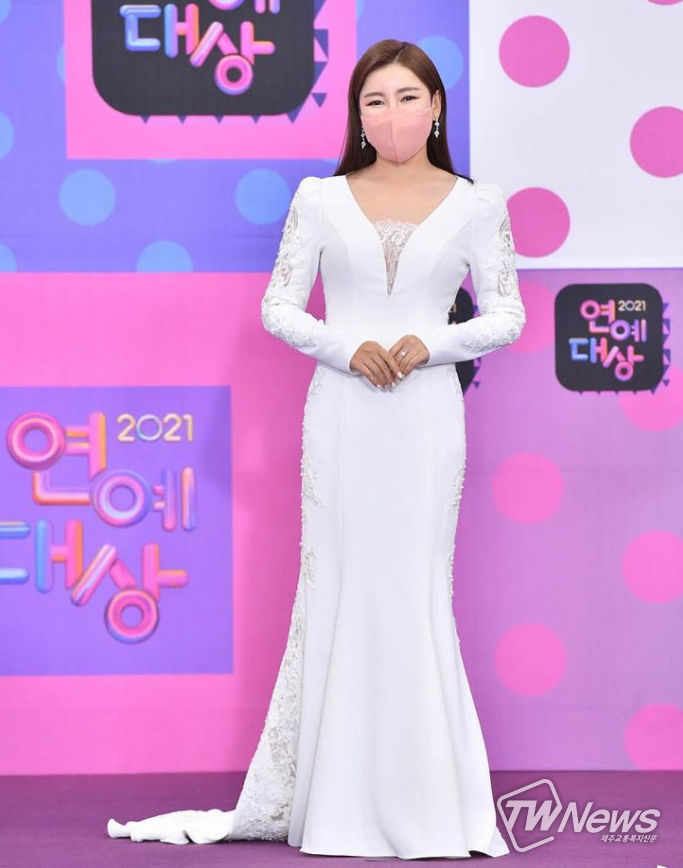 미스트롯 가수 송가인은 크리스마스인 25일 KBS연예대상 시상식전 하얀 드레스를 입고 포토존에서 포즈를 취했다. 여신을 모습을 연상케한다.