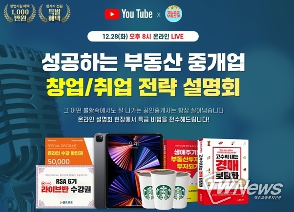 [제주교통복지신문 김현석 기자] 랜드프로 동래학원이 부동산중개업 취·창업 전략 설명회를 28일 오후 8시 유튜브 채널 ‘랜드프로 부동산TV’를 통해 개최한다고 전했다.