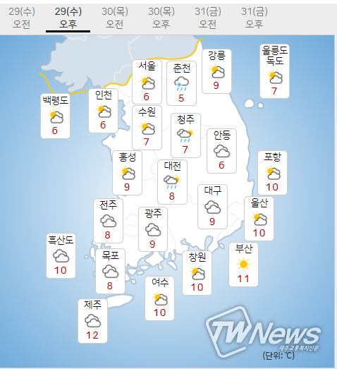 * 예상 강수량(29일 아침(09시)까지) 제주도: 1mm 미만