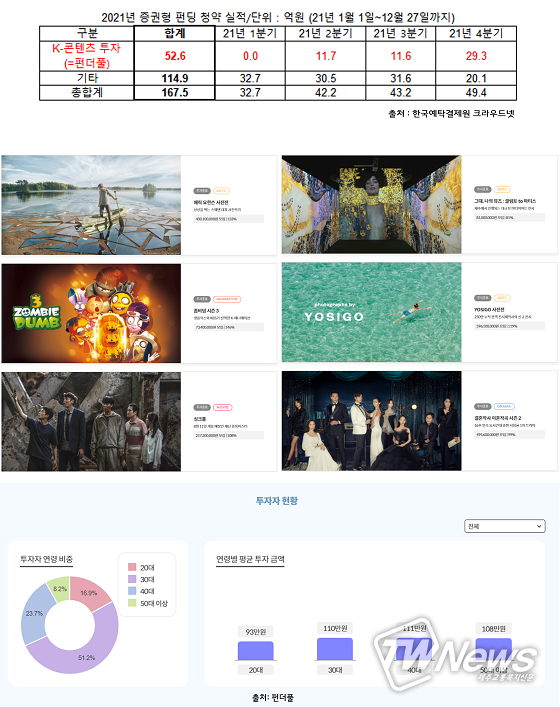 한국예탁결제원이 운영하는 크라우드넷에 따르면 2021년 누적 온라인 증권형 펀딩 총 청약 금액은 167억 으로 이 중 K-콘텐츠 투자 플랫폼 ‘펀더풀’을 통해 모집 된 청약 금액은 약 53억 원으로 전체 증권형 펀딩 사업자 중 1위를 차지했다.