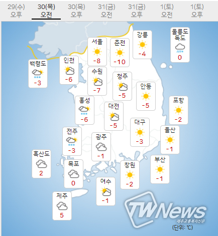 (30일) 아침최저기온은 서울 -7도, 인천 -6도, 수원 -7도 등 -12~-6도, 낮최고기온은 서울 -1도, 인천 -1도, 수원 -1도 등 -2~0도가 되겠다.