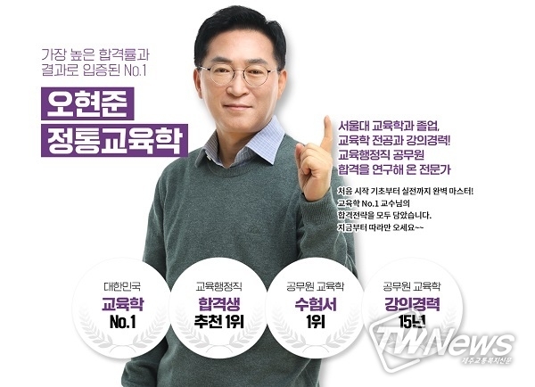 오현준 교수는 교육학 강의만 15년을 진행한 교육학 전문 교수로 높은 합격률과 결과를 입증해 온 실력 있는 교수다. 교육행정직의 필수과목 교육학을 주 강의로 다루고 있다. 서울·인천·강원도 교육청 5급 사무관 출제위원이자 일등 학원 연합 모의고사 출제위원 이력을 지녔다.