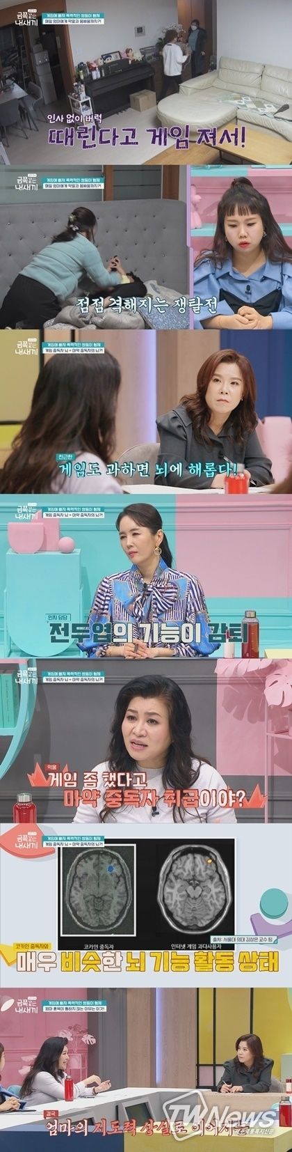 한편, 제작진이 직접 쌍둥이 게임 시간 관찰에 나서고, 그 결과 앉은 자리에서 3시간 동안 게임만 하는 쌍둥이의 모습을 확인한다. 이를 본 오은영은 “인간이 ‘중독’ 상태에 이르면 뇌에서 사고를 담당하는 전두엽의 기능이 감퇴하는데, 게임 중독자의 뇌를 살펴보면 마약 중독자의 뇌와 비슷하다는 연구 결과가 있다”라며 “게임 역시 과하면 마약처럼 해롭다”라고 말해 출연진들에게 충격을 안긴다.