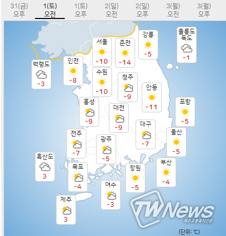 1월1일 아침최저기온은 서울 -10도, 수원 -10도, 춘천 -14도, 강릉 -5도, 대전 -9도, 광주 -5도, 여수 -3도, 대구 -7도, 부산 -4도, 제주도 3도를 기록하겠다.