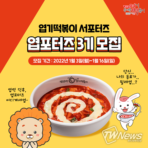 [제주교통복지신문 신혜정 기자] 동대문엽기떡볶이(주식회사 핫시즈너)에서 엽기떡볶이 홍보와 다양한 미션을 수행하며 호흡을 맞춰갈 브랜드 서포터즈를 모집한다고 밝혔다.