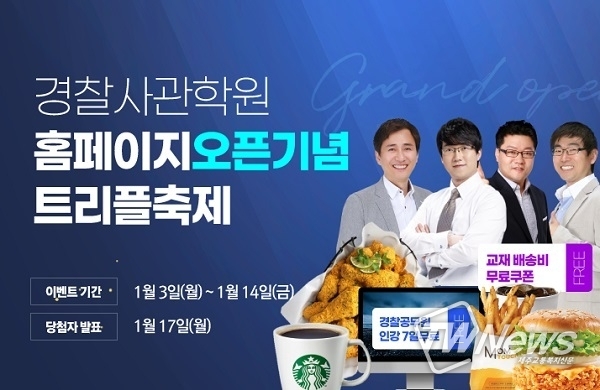 아울러 소문내기 이벤트도 진행 중이다. 경찰사관학원 리뉴얼 홈페이지를 홍보하면 스타벅스 아메리카노, 싸이버거 세트를 추첨을 통해 증정한다.
