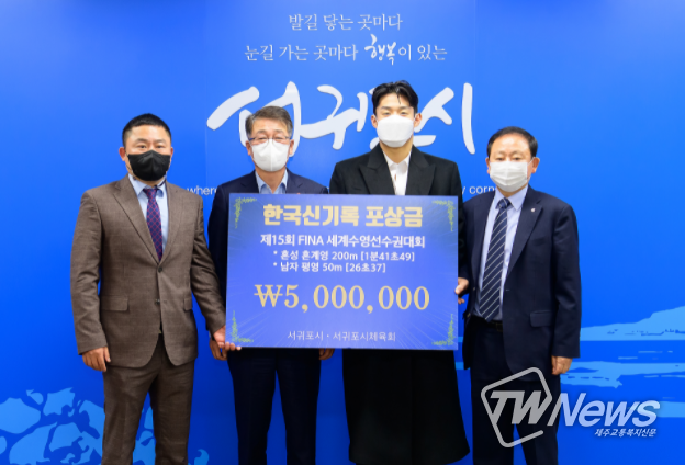[제주교통복지신문 김현석 기자] 서귀포시는 1월 5일 접견실에서 서귀포시청 직장운동경기부 소속 수영팀 문재권 선수에게 5백만원의 포상금을 전달했다.
