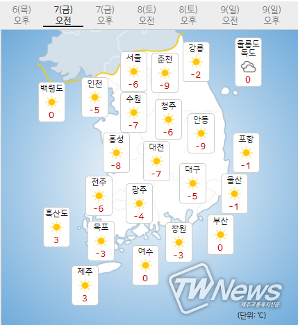 (7일) 아침최저기온은 서울 -6도, 인천 -5도, 수원 -7도 등 -12~-5도, 낮최고기온은 서울 4도, 인천 2도, 수원 4도 등 2~4도가 되겠다.