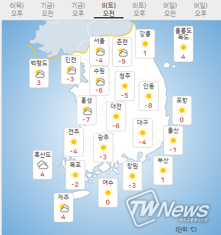 (8일) 아침최저기온은 서울 -4도, 인천 -3도, 수원 -6도 등 -11~-3도, 낮최고기온은 서울 6도, 인천 6도, 수원 6도 등 3~7도가 되겠다.