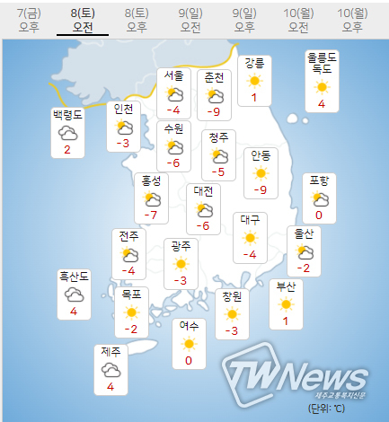 (8일) 아침최저기온은 서울 -4도, 인천 -3도, 수원 -6도 등 -12~-3도, 낮최고기온은 서울 5도, 인천 6도, 수원 5도 등 3~6도가 되겠다.