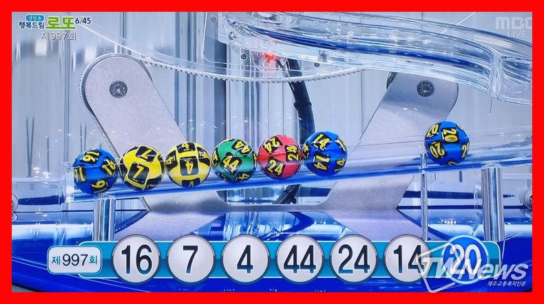 [제주교통복지신문 최효열 기자] 1월8일 997회 로또 1등당첨번호조회는 " 16, 7, 4, 44, 24, 14 "이다. 2등 보너스번호는 " 20 "이다.