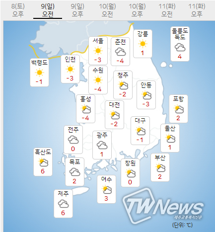 (9일) 아침최저기온은 서울 -3도, 인천 -3도, 수원 -4도 등 -7~-2도, 낮최고기온은 서울 4도, 인천 2도, 수원 4도 등 2~5도가 되겠다.