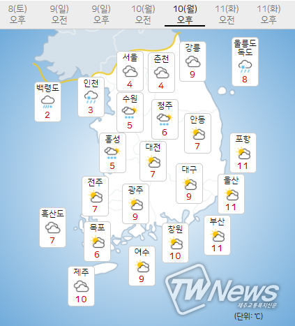 (10일) 아침최저기온은 3~5도(평년 2~4도), 낮최고기온은 9~12도(평년 8~11도)가 되겠다.