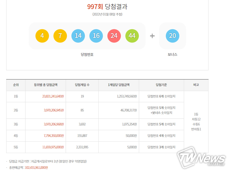[제주교통복지신문 최효열 기자] 997회 로또 1등당첨번호조회는 " 16, 7, 4, 44, 24, 14 "이다. 2등 보너스번호는 " 20 "이다.