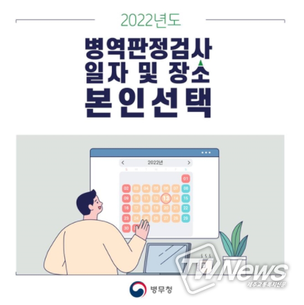 [제주교통복지신문 김대훈 기자] 2022년도 병역판정검사 대상자는 병역판정검사 일자 및 장소를 본인이 직접 선택하여 병역판정검사(약 4시간 소요)를 받으실 수 있습니다.