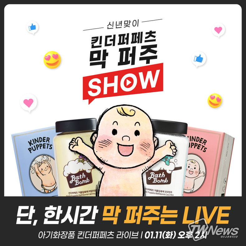 [제주교통복지신문 신혜정 기자] 천연 아기화장품 브랜드 킨더퍼페츠가 오는 11일 오후 2시 네이버 쇼핑 기획 라이브 방송을 통해 역대급 혜택을 담은 신년맞이 ‘막 퍼주 SHOW’ 이벤트를 진행한다.