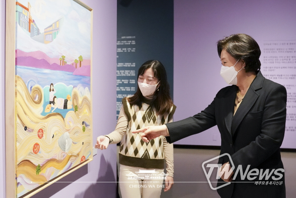 제주도에서 올라왔다는 이진원 작가의 어머니가 “이런 공간에서 전시를 할 수 있게 되어 감사하다”고 말하자, 김정숙 여사는 “감사한 일로 그칠 게 아니라, 이런 전시를 일상적으로 할 수 있도록 국가가 더욱 노력하겠다”고 답했다.