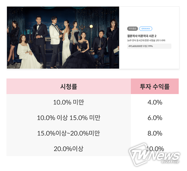 이번 드라마 '결혼작사 이혼작곡 시즌3' 드라마 투자 상품은 2022년 상반기 방영 예정인 TV 채널의 시청률에 연동하여 수익을 제공할 예정이며, 드라마 최고 시청률에 따라 최대 10% 수익을 제공할 예정이다.