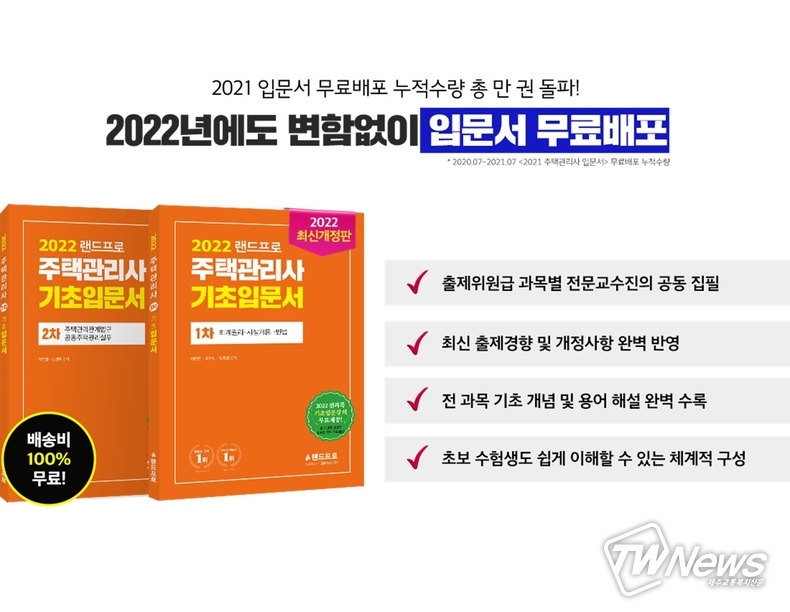 업체 측에 따르면 랜드프로 홈페이지에서 이달 31일까지 2022년 주택관리사 자격증 시험 일정 대비 기초입문서 1차·2차를 매일 선착순 100명에게 배송비, 교재비 없이 무료로 증정하는 이벤트를 전개한다. 본 교재와 함께 공부하기 좋은 시험과목별 기초입문 인강도 무상으로 지원한다.