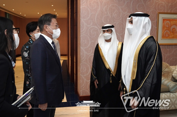 문 대통령 부부는 수하일 모하메드 알 마즈로이 에너지인프라부 장관, 압둘라 사이프 알누아이미 주한UAE 대사의 환영을 받았다.