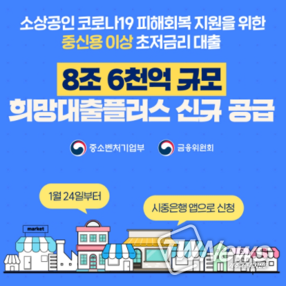 [제주교통복지신문 김대훈 기자] 중신용 이상 소기업·소상공인의 피해회복 지원을 위해 초저금리의 ‘희망대출플러스’ 8조 6천억 원을 1월 24일부터 공급합니다.