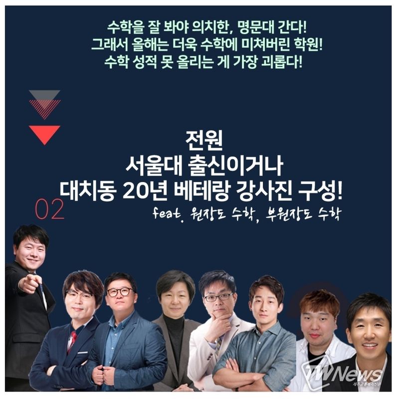 최유신 원장님이 수학을 직강하고 김영제 부원장(서울대 수학과),최경식 선생님(서울대 수학교육과)등 대치동 경력 15년이상 강사진이 포진돼 있다.