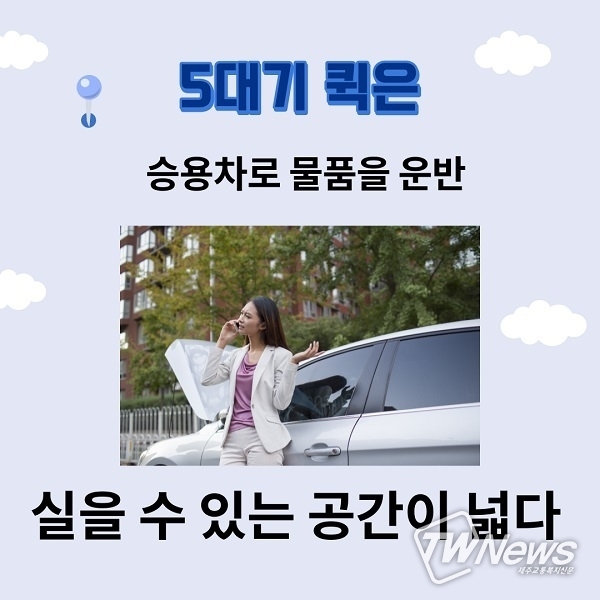 [제주교통복지신문 신혜정 기자] 5대기가 유휴 승용차 활용한 물품 운반 서비스를 론칭했다고 30일 밝혔다. 기존의 오토바이 퀵서비스의 불편함은 해소한 반면, 안전성은 높였다.