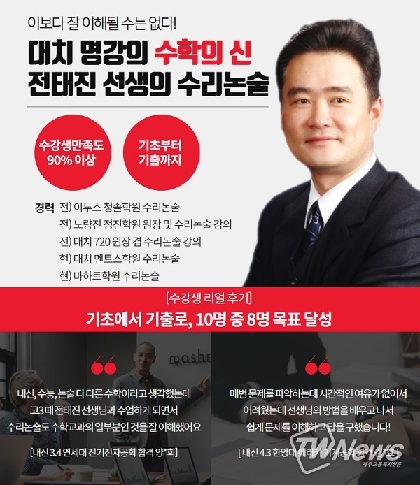 또한, 전태진원장은 2023학년도 수리논술 준비를 위한 수험생과 학부모를 위해 맞춤논술 합격전략을 위한 수리논술로 대학가기 유튜브 방송을 진행해 많은 정보를 제공하고 있다.