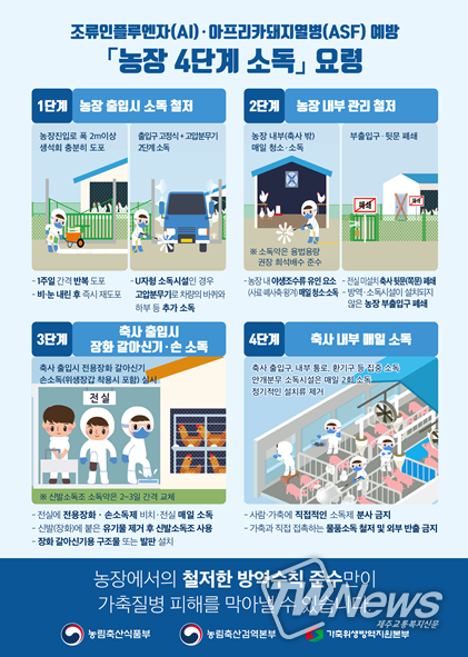 중수본은 “가금농장 관계자들은 최근 야생조류와 가금농장에서 고병원성 조류인플루엔자가 연이어 발생하고 있는 만큼, 긴장을 늦추지 말고 출입 차량 2중 소독(고정식+고압 분무)을 포함한 농장 4단계 소독, 소독·방역 시설이 없는 농장 부출입구·축사 쪽문 폐쇄 등 방역수칙 준수와 차단방역을 꼼꼼히 실천해야 한다”라고 강조했다.