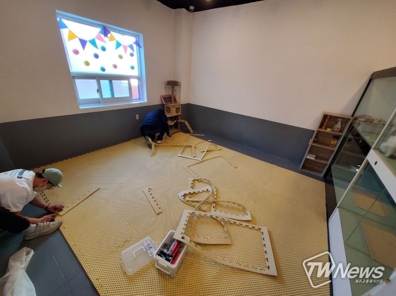 [제주교통복지신문 신혜정 기자] 바닥프로젝트 X 헬시냥이, 반려동물 보호소에 매트 기부 및 봉사활동 진행 EDTC(이하, 바닥프로젝트, 헬시냥이) 와 가람매트(이하, 블랙스퀘어, 쏘옥매트 제조사) 임직원 일동이 지난달 21일 대전 서구 월평동에 위치한 유기 동물 보호소 페츠라이프에 블랙스퀘어 매트와 헬시냥이 사막화 매트를 기부해 직접 시공했다.
