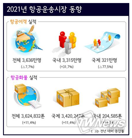 [제주교통복지신문 김대훈 기자] 국토교통부는 ’21년 항공여객이 전년 대비 7.7% 감소한 3,636만 명으로, 국제선 여객은 전년 대비 77.5% 감소(’19년 대비 96.4% 감소)한 321만 명을, 국내선 여객은 전년 대비 31.7% 증가(’19년 대비 0.5% 증가)한 3,315만 명을 기록했다고 밝혔다.