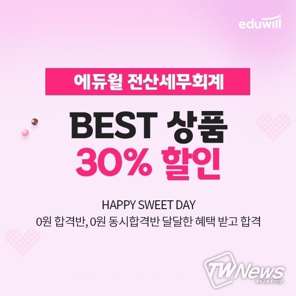 업체 측에 따르면 'HAPPY SWEET DAY'는 에듀윌에서 진행 중인 전산세무·회계 '0원 합격반', '동시합격반' 과정을 최대 30% 저렴하게 제공하는 할인 이벤트다.