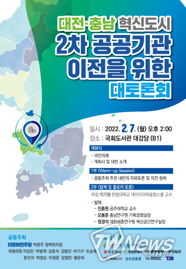 이번 '2차 공공기관 이전을 위한 대토론회'는 대전·충남을 지역구로 둔 더불어민주당 국회의원 전원(박완주·이상민·박범계·강훈식·김종민·어기구·조승래·문진석·박영순·이정문·장철민·황운하)이 공동주최하며 충남연구원, 대전세종연구원을 비롯해 중도일보·충청투데이·충청일보·금강일보·디트뉴스·굿모닝충청·대전MBC·TJB 등 지역대표 언론사가 공동주관으로 참여한다.