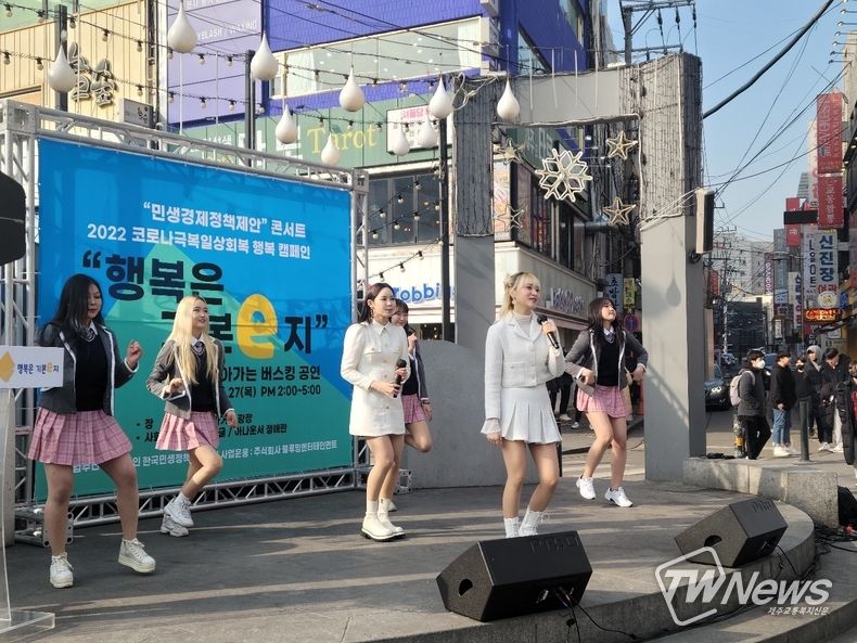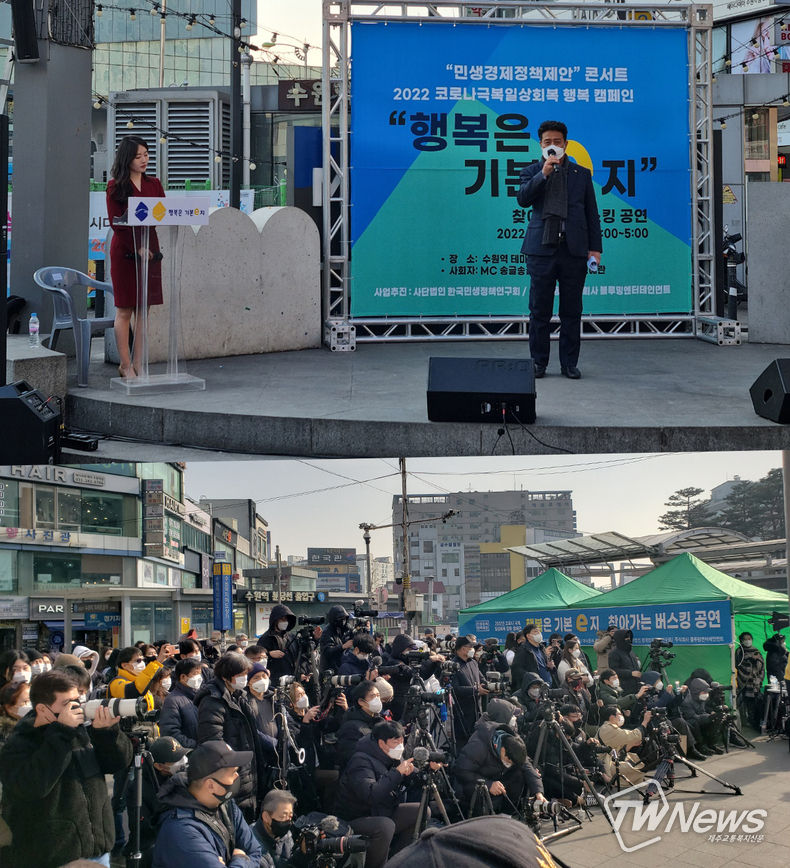[제주교통복지신문 신혜정 기자] 경기 수원시 소재 수원역 테마 거리 광장에서 중소상공인자영업 연합회, 문화예술인, 영세상인, 모빌리티플랫폼 상생협의회, 수원지역민들과 함께 코로나 위기 극복과 민생경제 라는 주제와 행복은 기본e지 라는 슬로건으로 '민생경제 정책제안' 콘서트를 진행됐다.