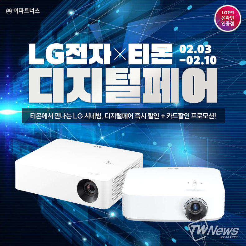 [제주교통복지신문 김지홍 기자] LG전자 공식 전문점 ‘이파트너스’가 LG시네빔의 주요 인기 모델에 대해 ‘티몬 디지털 페어’를 통해 할인 및 사은품 증정 행사를 진행한다고 4일 밝혔다.
