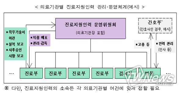 타당성 검증에 참여하게 되는 기관은 의료기관 여건에 맞게 원내 ‘(가칭)진료지원인력 운영위원회’를 구성하고, ‘진료지원인력 관리·운영지침’을 마련하여 각 진료과 등에 배포하게 된다.